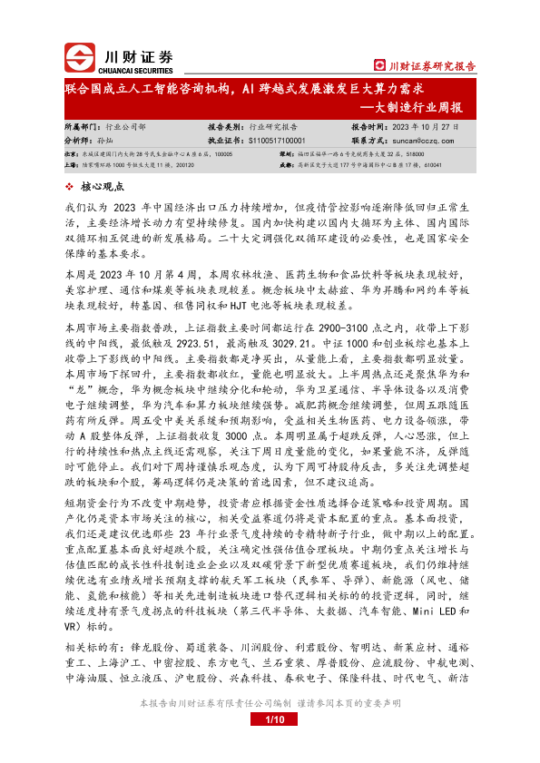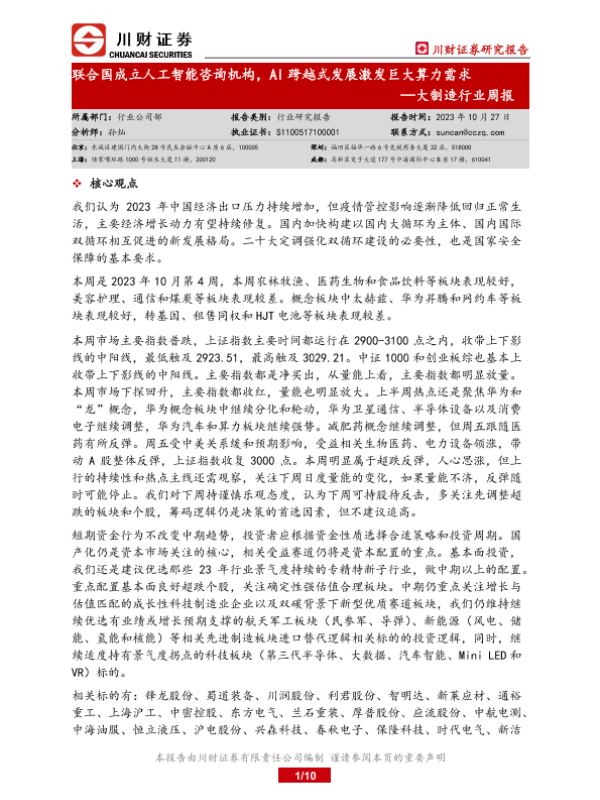 【川财证券】【20231027】大制造行业周报:联合国成立人工智能咨询机构,AI跨越式发展激发巨大算力需求-10页