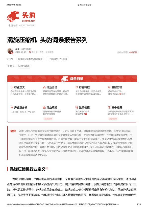 【头豹研究院】【202309】涡旋压缩机 头豹词条报告系列-16页