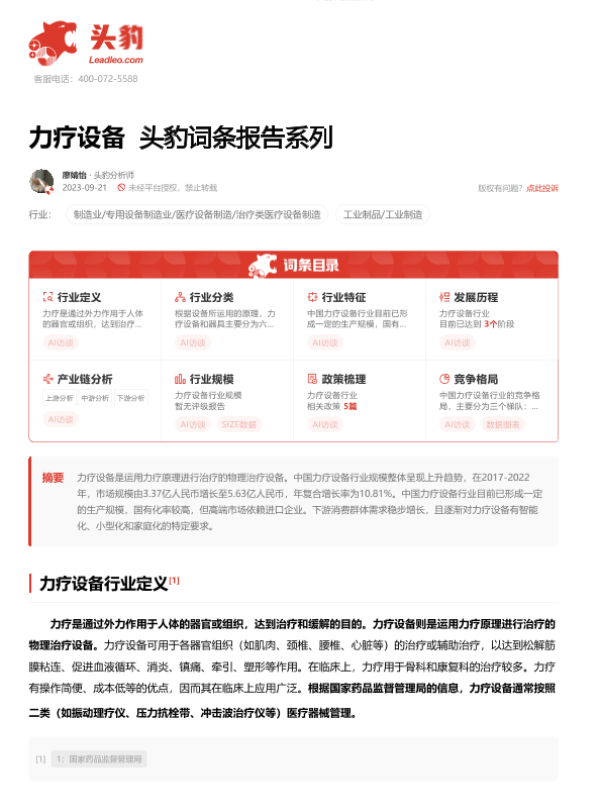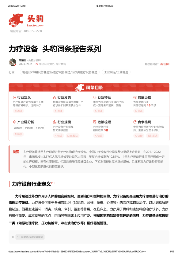 【头豹研究院】【20230921】力疗设备 头豹词条报告系列-19页