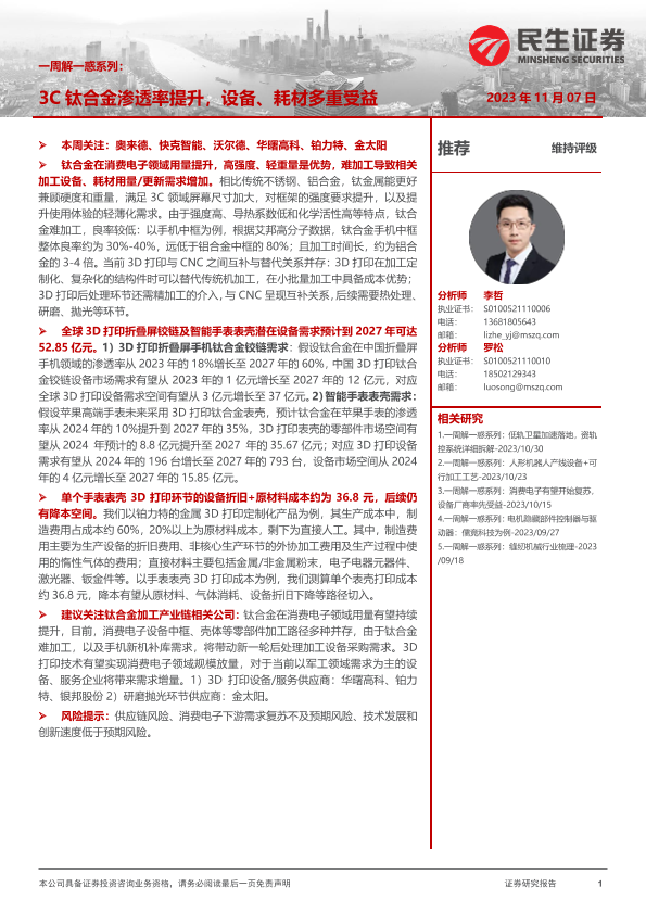 【民生证券】【20231107】机械一周解一惑系列:3C钛合金渗透率提升,设备、耗材多重受益-21页