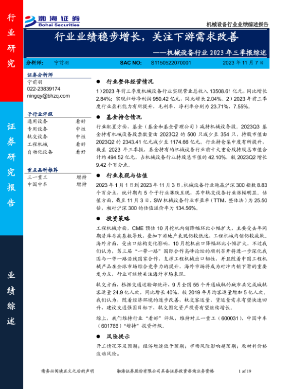 【渤海证券】【20231107】机械设备行业2023年三季报综述:行业业绩稳步增长,关注下游需求改善-19页