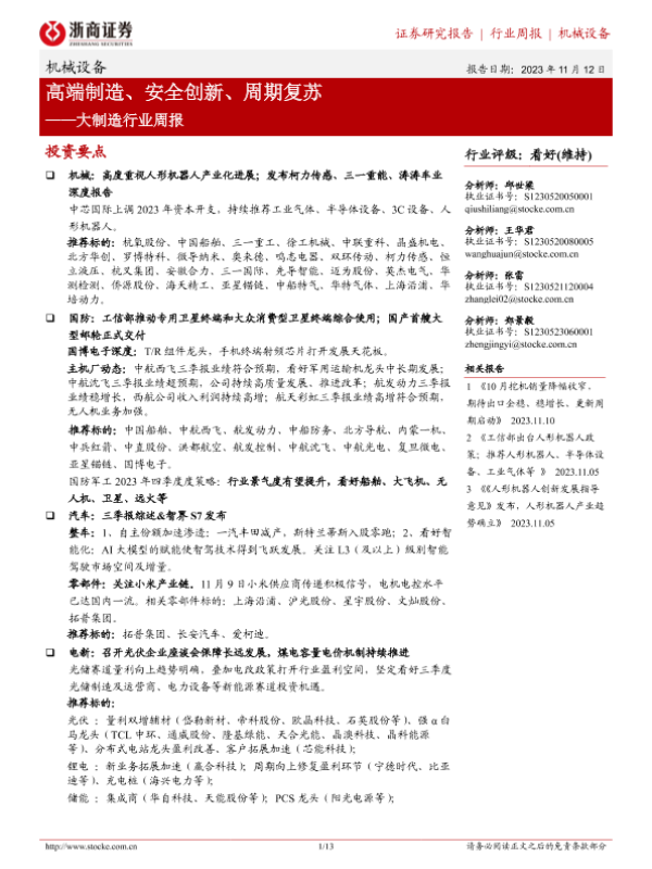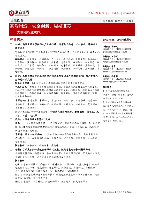 【浙商证券】【20231112】大制造行业周报:高端制造、安全创新、周期复苏-13页
