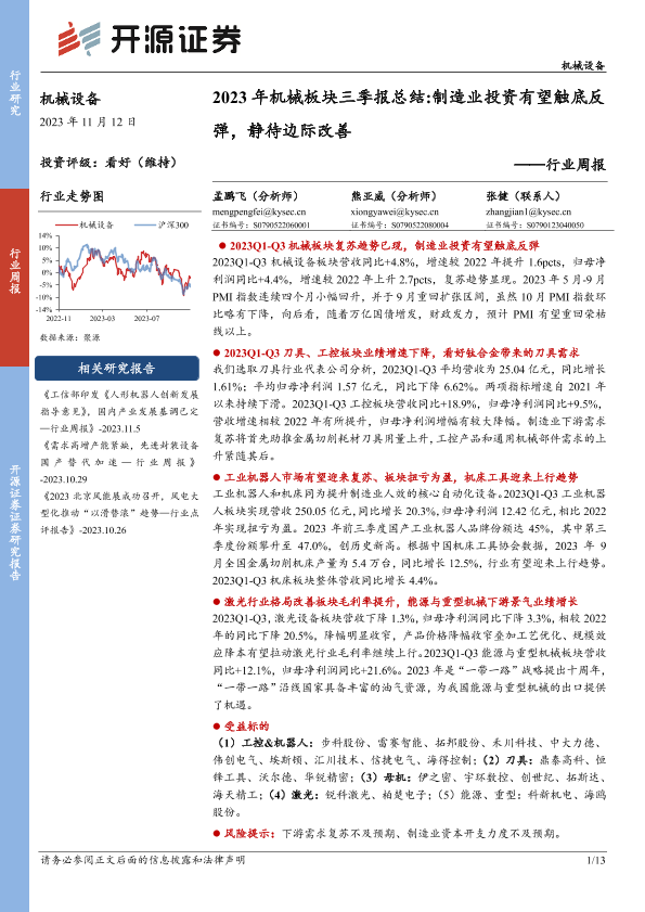 【开源证券】【20231112】2023年机械板块三季报总结:制造业投资有望触底反弹,静待边际改善-13页