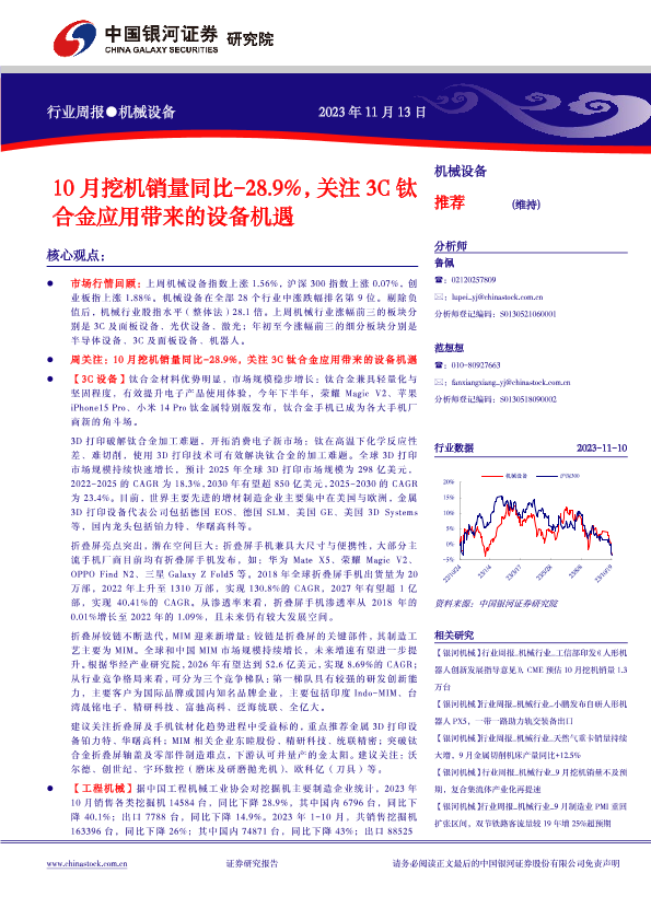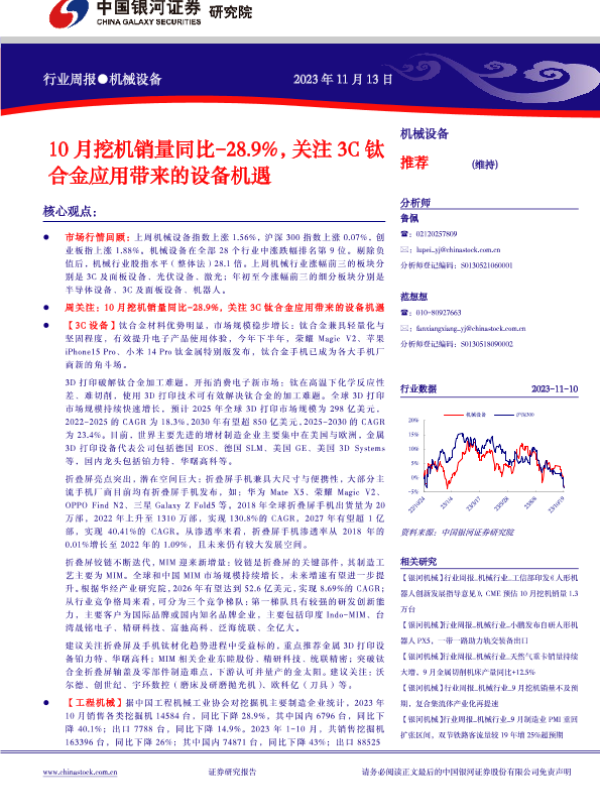 【银河证券】【20231113】20231113-中国银河-机械设备行业周报:10月挖机销量同比-28.9%,关注3C钛合金应用带来的设备机遇-26页