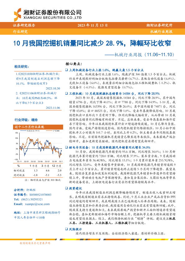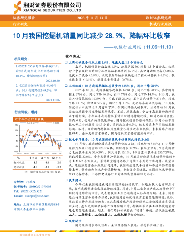 【湘财证券】【20231113】20231113-湘财证券-机械行业周报:10月我国挖掘机销量同比减少28.9%,降幅环比收窄-13页