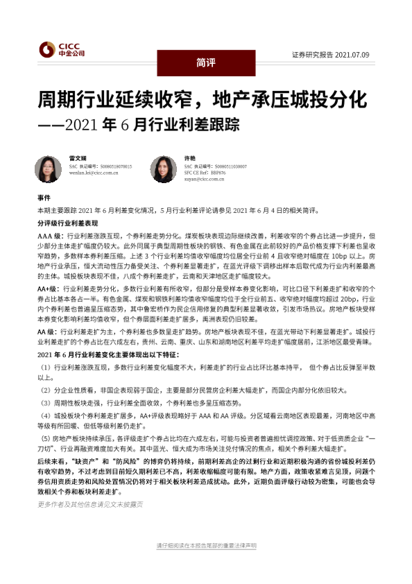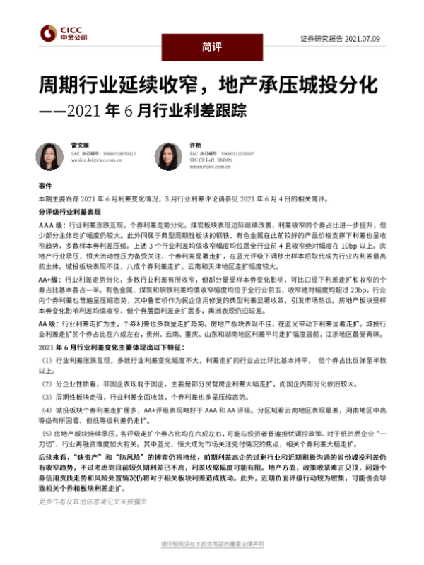 【中金公司】【20210709】2021年6月行业利差跟踪:周期行业延续收窄,地产承压城投分化-13页