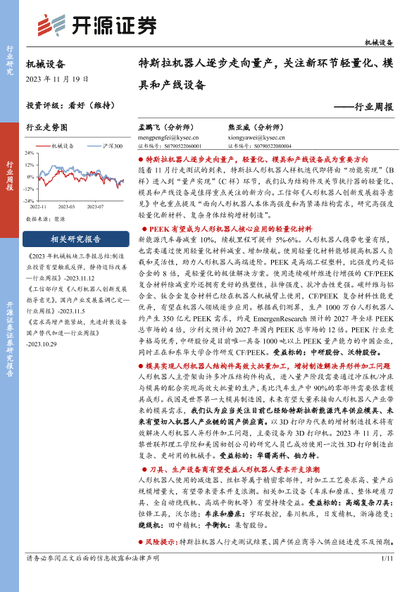 【开源证券】【20231119】20231119-开源证券-机械设备行业周报:特斯拉机器人逐步走向量产,关注新环节轻量化、模具和产线设备-11页
