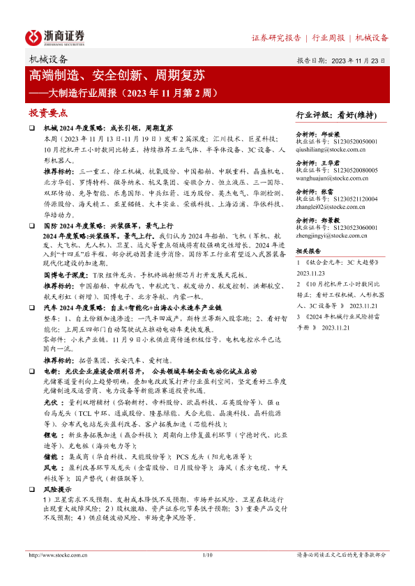 【浙商证券】【20231123】大制造行业周报(2023年11月第2周):高端制造、安全创新、周期复苏-10页