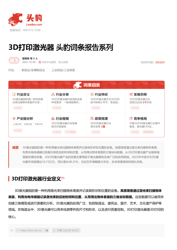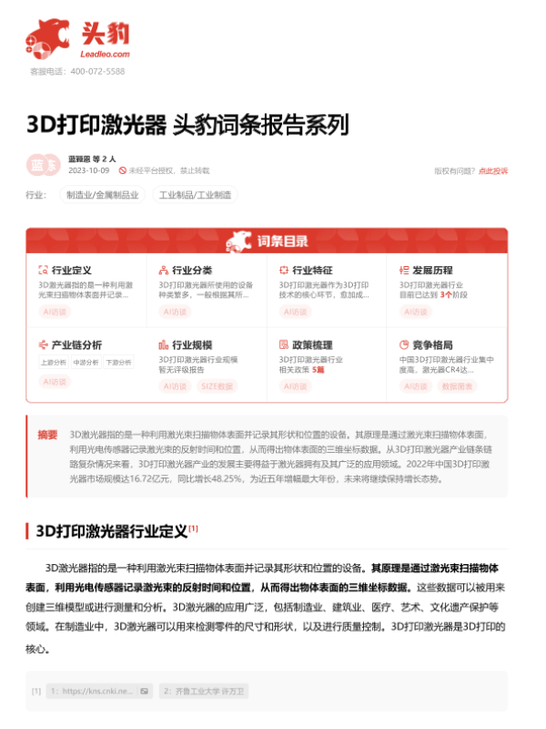 【头豹研究院】【20231009】3D打印激光器 头豹词条报告系列-20页
