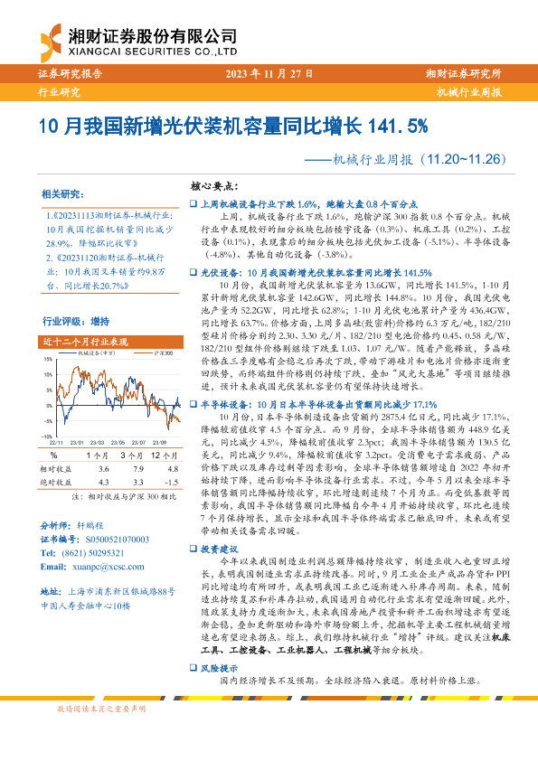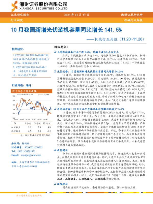 【湘财证券】【20231127】20231127-湘财证券-机械行业周报:10月我国新增光伏装机容量同比增长141.5%-13页