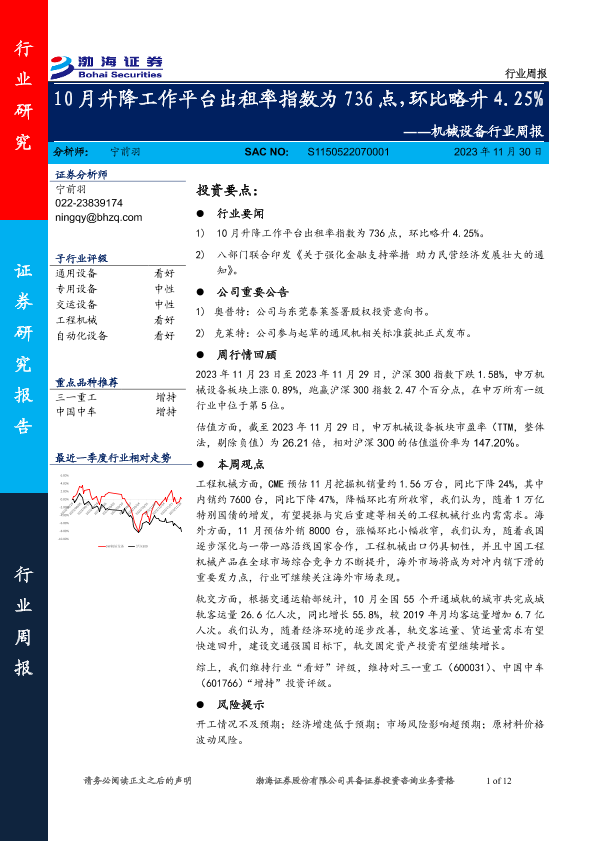 【渤海证券】【20231130】20231130-渤海证券-机械设备行业周报:10月升降工作平台出租率指数为736点,环比略升4.25%-12页