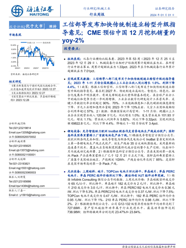 【海通证券】【20240101】20240101-海通证券-机械工业行业周报:工信部等发布加快传统制造业转型升级指导意见;CME预估中国12月挖机销量约yoy-2%-10页