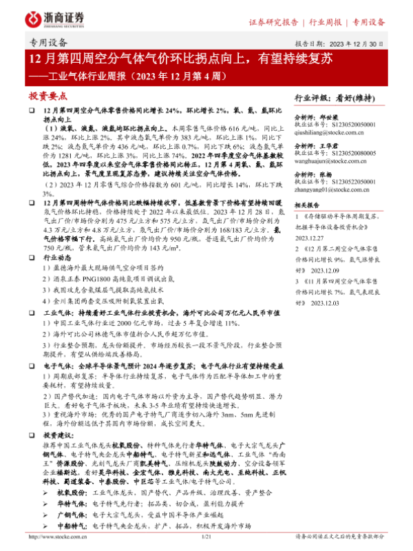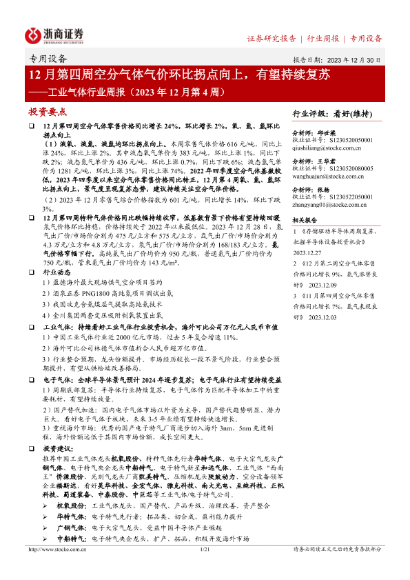 【浙商证券】【20231230】12月第四周空分气体气价环比拐点向上,有望持续复苏-21页