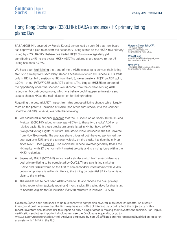 【Goldman Sachs】【20220727】BABA宣布香港主要上市计划;买入-8页
