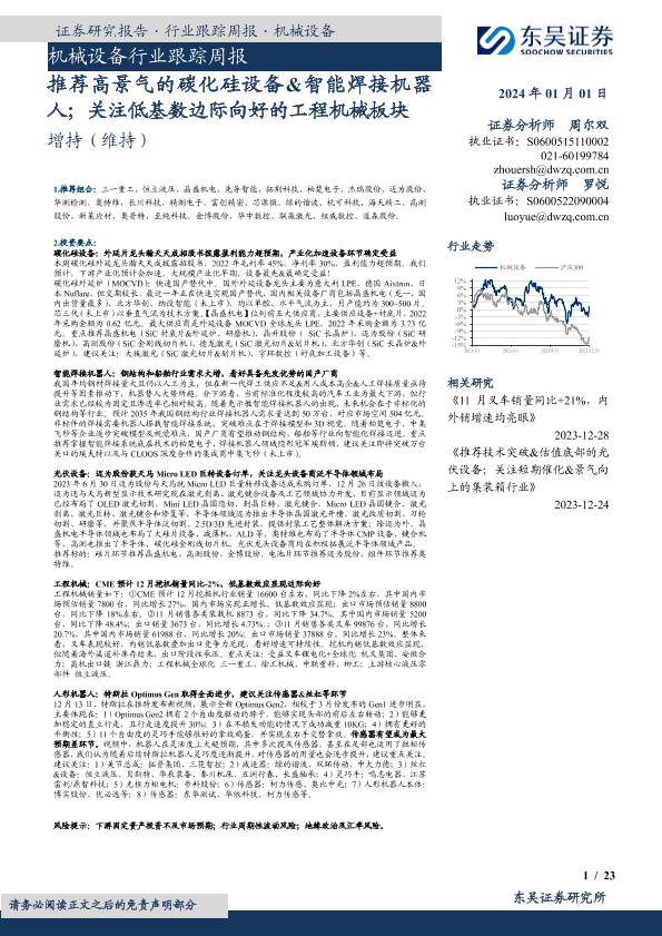 【东吴证券】【20240101】20240101-东吴证券-机械设备行业跟踪周报:推荐高景气的碳化硅设备&智能焊接机器人;关注低基数边际向好的工程机械板块-23页