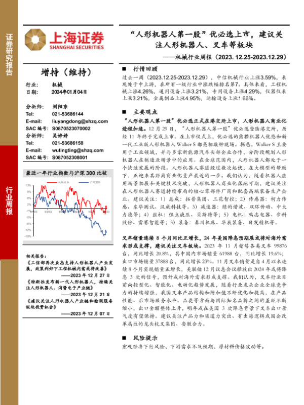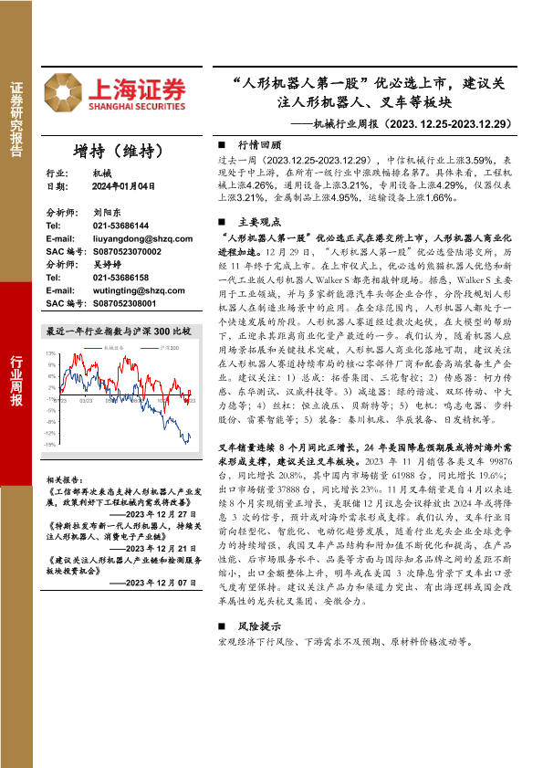 【上海证券】【20240104】“人形机器人第一股”优必选上市,建议关注人形机器人、叉车等板块-16页