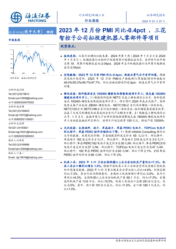【海通证券】【20240107】20240107-海通证券-机械工业行业周报:2023年12月份PMI同比-0.4pct,三花智控子公司拟投建机器人零部件等项目-10页