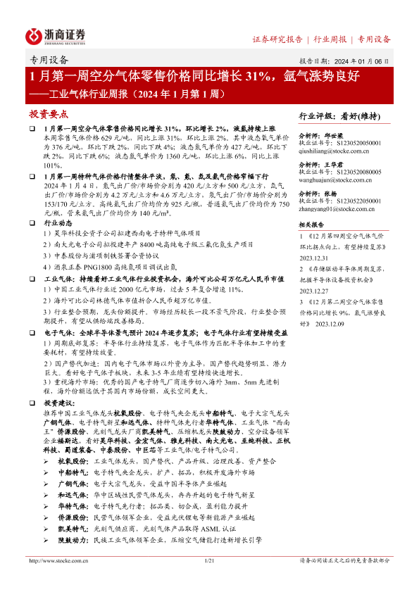 【浙商证券】【20240106】2024年1月第1周工业气体行业周报:1月第一周空分气体零售价格同比增长31%,氩气涨势良好-21页