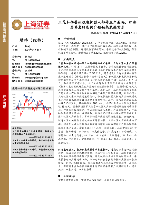 【上海证券】【20240110】20240110-上海证券-机械行业周报:三花和拓普拟投建机器人部件生产基地,红海局势发酵或提升船舶集装箱需求-15页