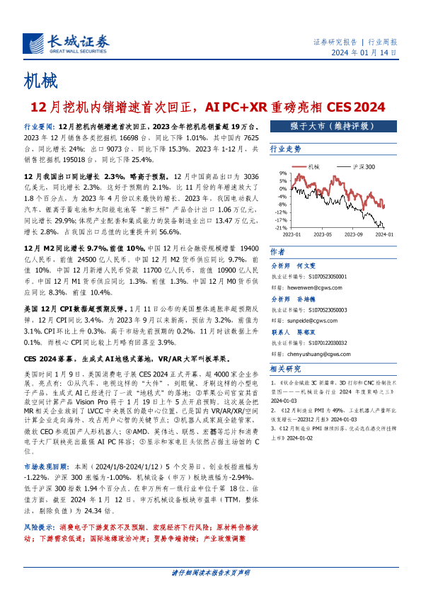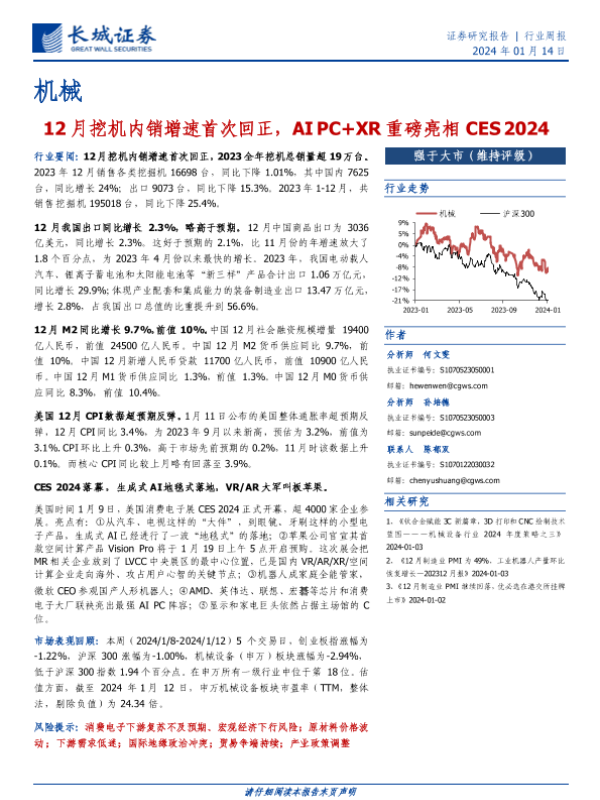 【长城证券】【20240114】20240114-长城证券-机械行业周报:12月挖机内销增速首次回正,AIPC+XR重磅亮相CES 2024-12页