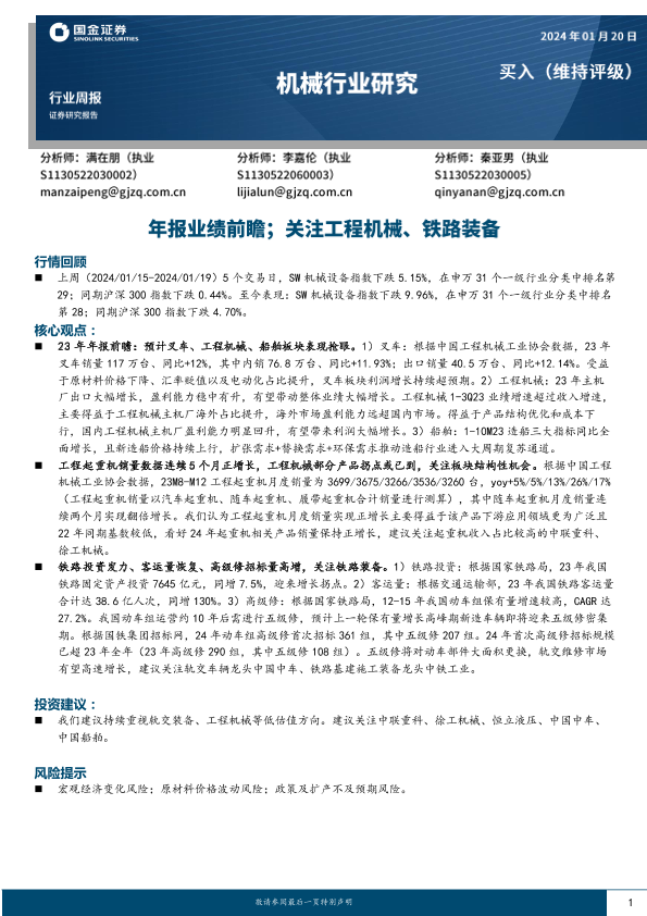 【国金证券】【20240120】20240120-国金证券-机械行业研究:年报业绩前瞻;关注工程机械、铁路装备-17页