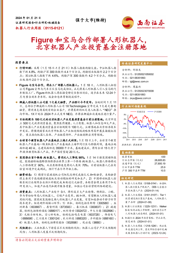 【西南证券】【20240121】机器人行业周报:Figure和宝马合作部署人形机器人,北京机器人产业投资基金注册落地-11页