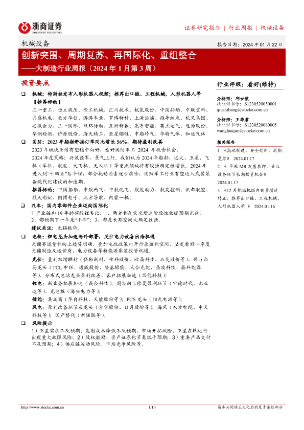 【浙商证券】【20240122】大制造行业周报(2024年1月第3周):创新突围、周期复苏、再国际化、重组整合-10页