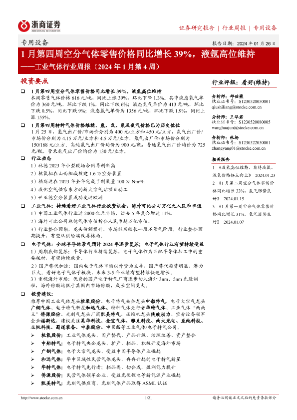 【浙商证券】【20240126】2024年1月第4周工业气体行业周报:1月第四周空分气体零售价格同比增长39%,液氩高位维持-21页