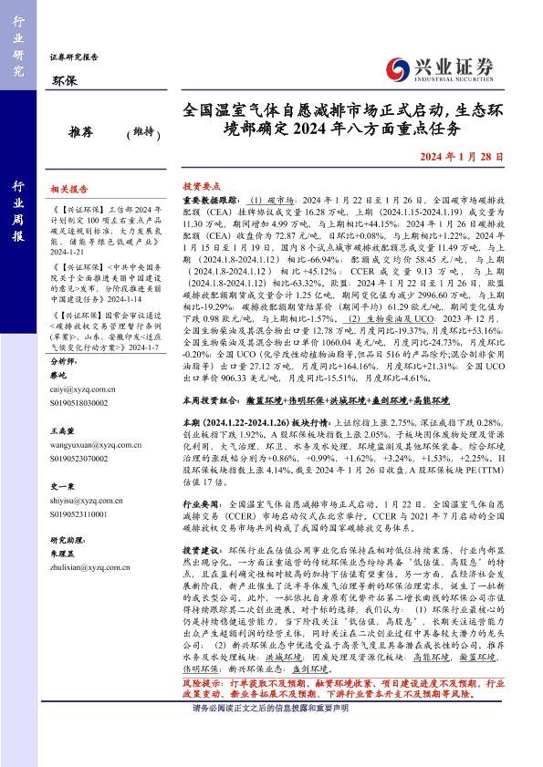 【兴业证券】【20240128】环保行业周报:全国温室气体自愿减排市场正式启动,生态环境部确定2024年八方面重点任务-13页