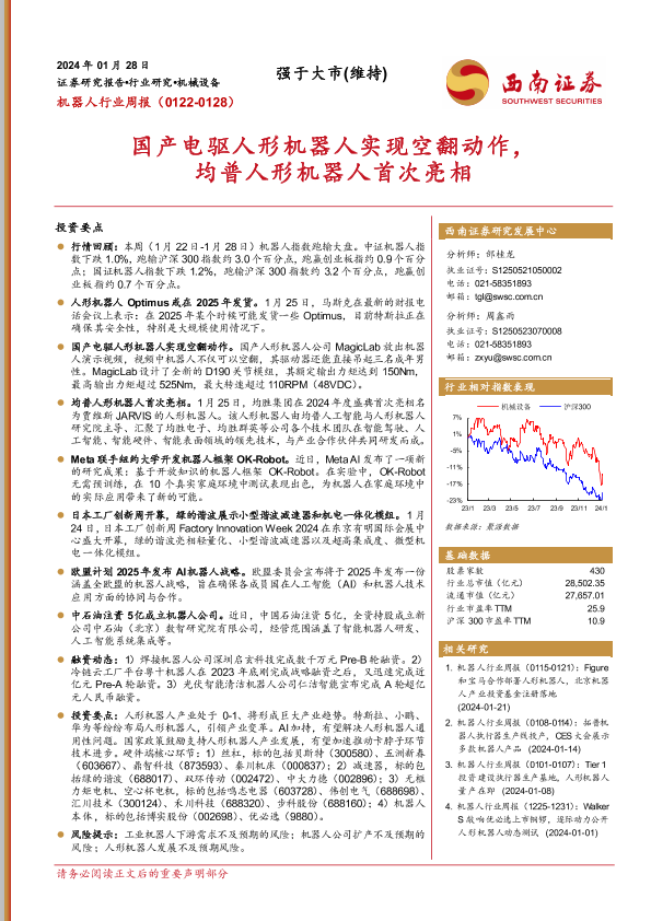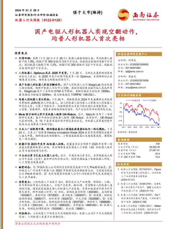 【西南证券】【20240128】机器人行业周报:国产电驱人形机器人实现空翻动作,均普人形机器人首次亮相-11页
