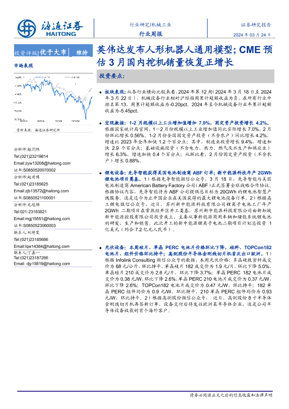 【海通证券】【20240324】20240324-海通证券-机械工业行业周报:英伟达发布人形机器人通用模型;CME预估3月国内挖机销量恢复正增长-10页