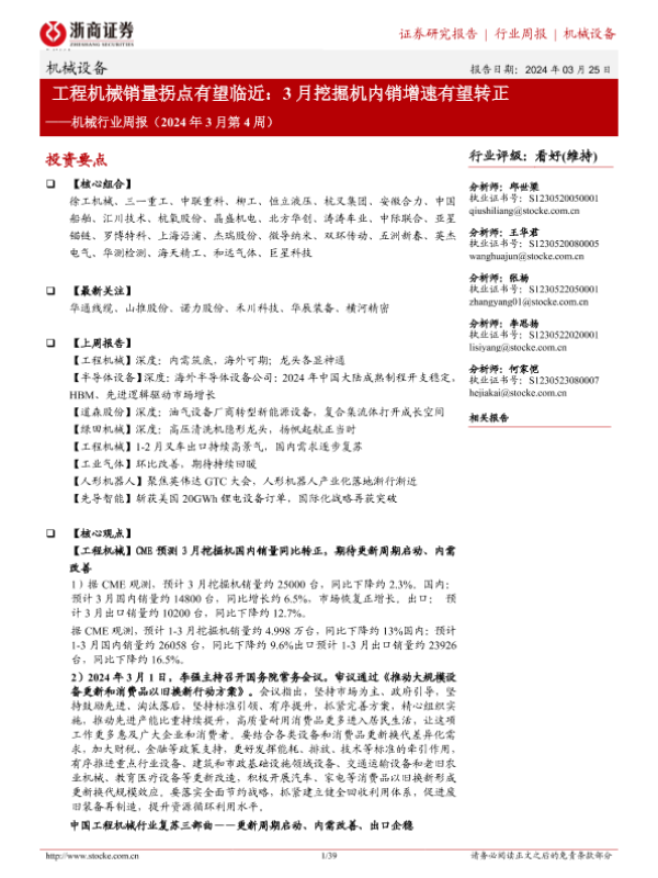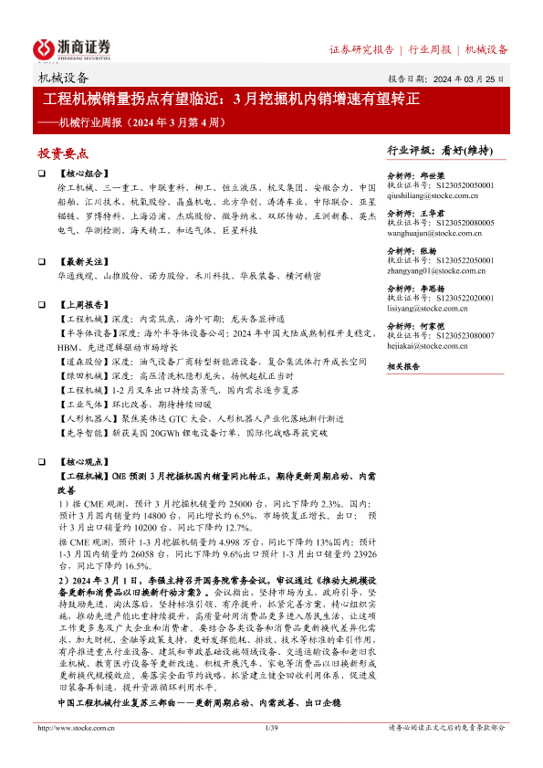 【浙商证券】【20240325】2024年3月第4周机械行业周报:工程机械销量拐点有望临近:3月挖掘机内销增速有望转正-39页