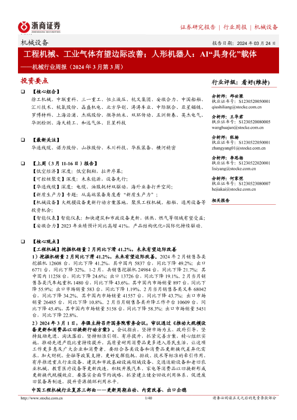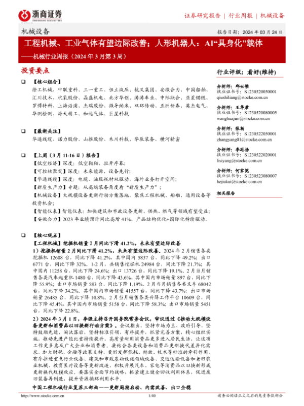 【浙商证券】【20240324】机械行业周报(2024年3月第3周):工程机械、工业气体有望边际改善;人形机器人:AI“具身化”载体-40页