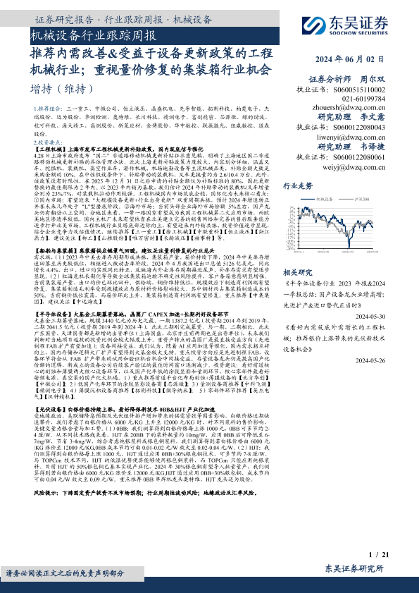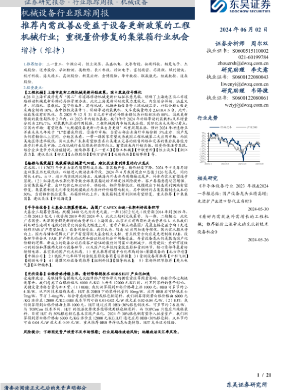 【东吴证券】【20240602】20240602-东吴证券-机械设备行业跟踪周报:推荐内需改善&受益于设备更新政策的工程机械行业;重视量价修复的集装箱行业机会-21页
