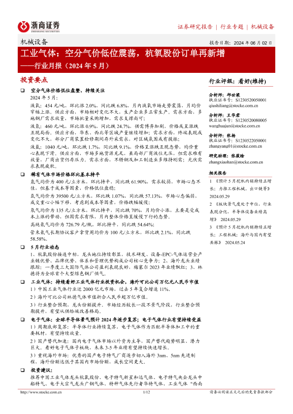 【浙商证券】【20240602】2024年5月机械设备行业月报:工业气体:空分气价低位震荡,杭氧股份订单再新增-12页