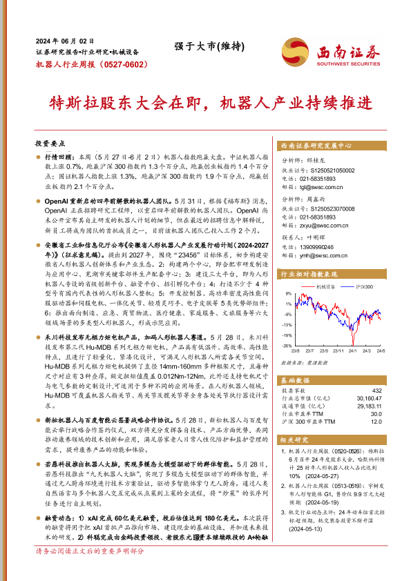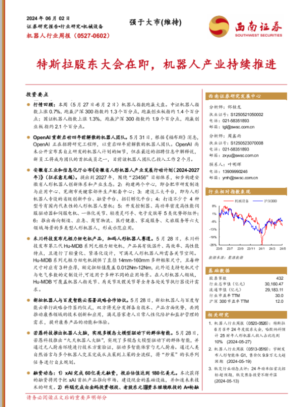 【西南证券】【20240602】20240602-西南证券-机器人行业周报:特斯拉股东大会在即,机器人产业持续推进-13页