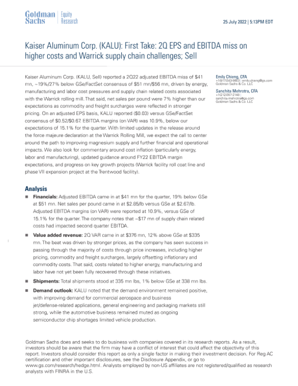 【Goldman Sachs】【20220725】Kaiser Aluminum Corp. (KALU) 第二季度每股收益和EBITDA未达预期,主要受成本增加和Warrick供应链问题影响;卖出评级-7页