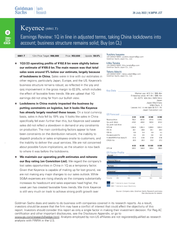 【Goldman Sachs】【20220728】Keyence(6861.T) 财报回顾:考虑中国封锁因素后的1Q业绩调整;业务结构保持稳健;买入评级-10页