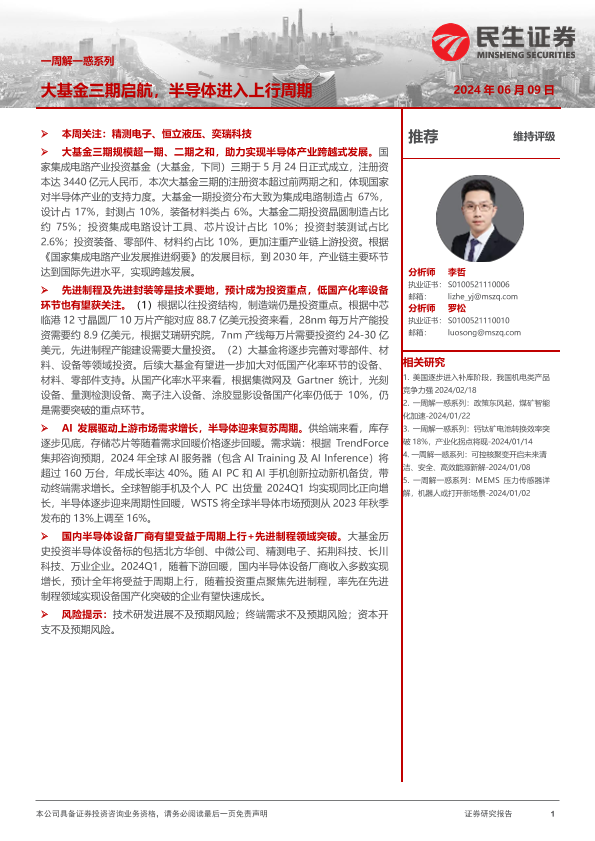 【民生证券】【20240609】20240609-民生证券-机械一周解一惑系列:大基金三期启航,半导体进入上行周期-18页