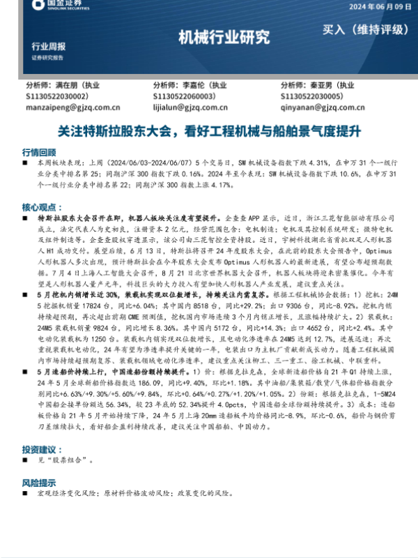 【国金证券】【20240609】20240609-国金证券-机械行业周报:关注特斯拉股东大会,看好工程机械与船舶景气度提升-17页