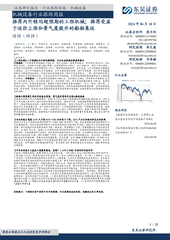 【东吴证券】【20240610】20240610-东吴证券-机械设备行业跟踪周报:推荐内外销均超预期的工程机械;推荐受益于运价上涨和景气度提升的船舶集运-22页