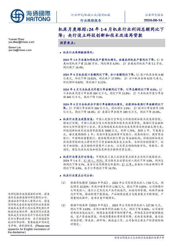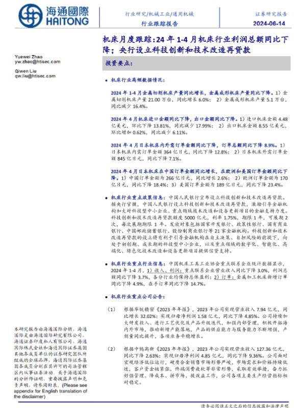 【海通国际】【20240614】20240614-海通国际-机床月度跟踪:24年1-4月机床行业利润总额同比下降;央行设立科技创新和技术改造再贷款-14页