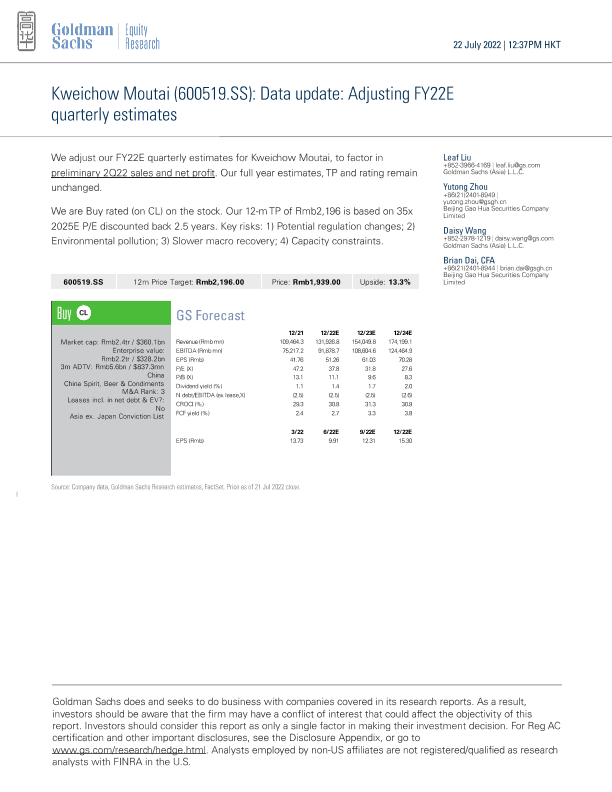 【Goldman Sachs】【20220722】Kweichow Moutai (600519.SS) Data update Adjusting FY22E quarterly estimates-5页