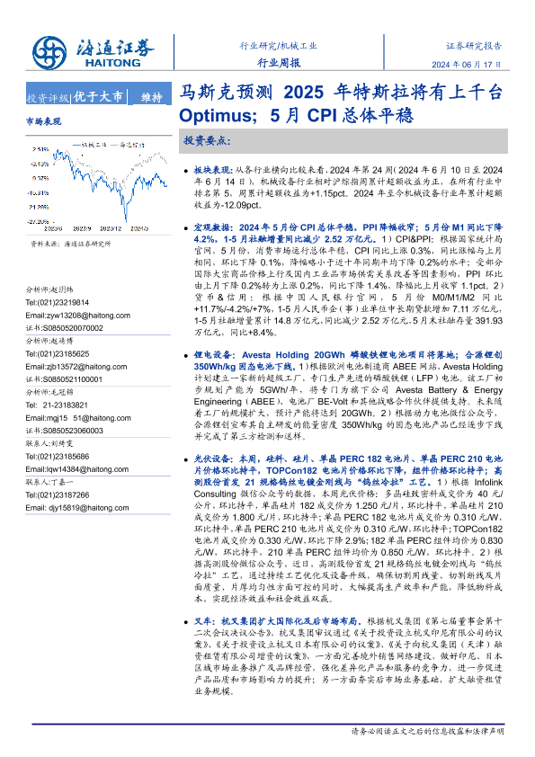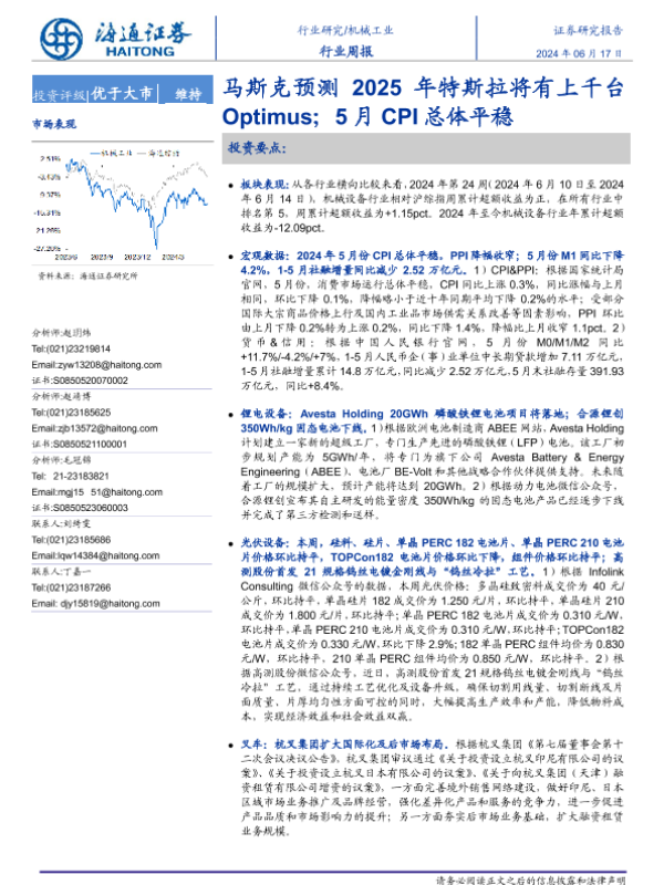 【海通证券】【20240617】20240617-海通证券-机械工业行业周报:马斯克预测2025年特斯拉将有上千台Optimus;5月CPI总体平稳-11页