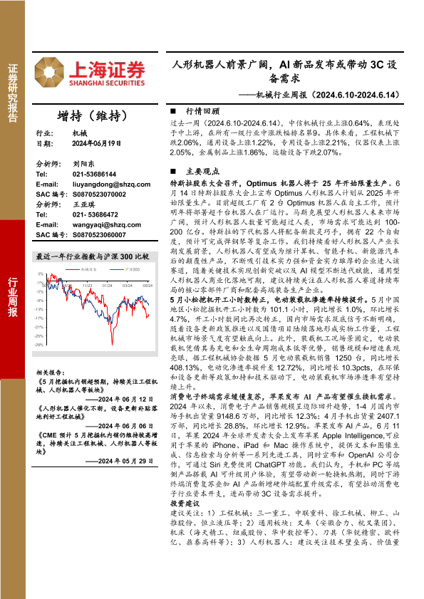 【上海证券】【20240619】20240619-上海证券-机械行业周报:人形机器人前景广阔,AI新品发布或带动3C设备需求-15页