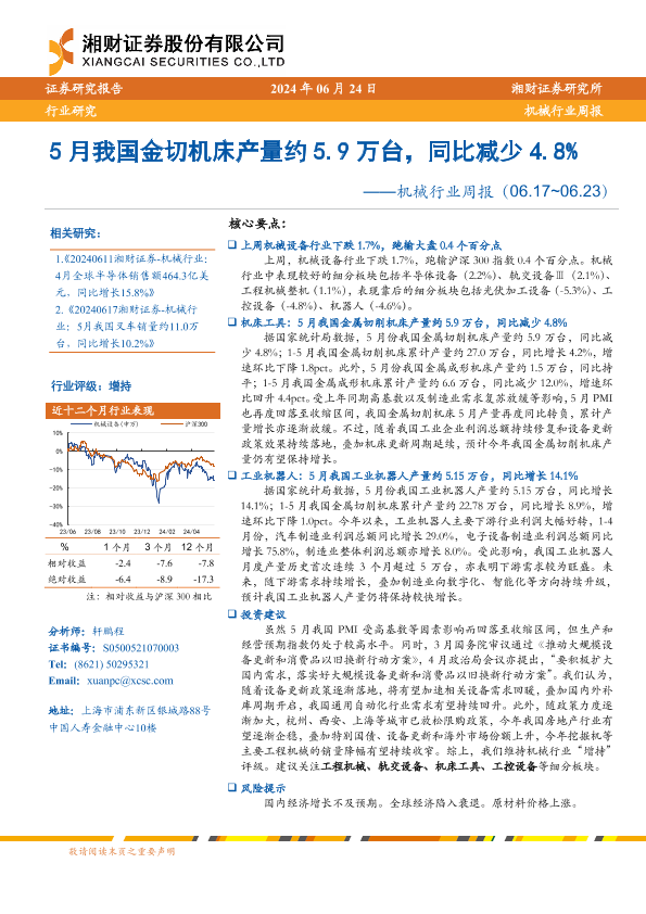 【湘财证券】【20240624】20240624-湘财证券-机械行业周报:5月我国金切机床产量约5.9万台,同比减少4.8%-13页