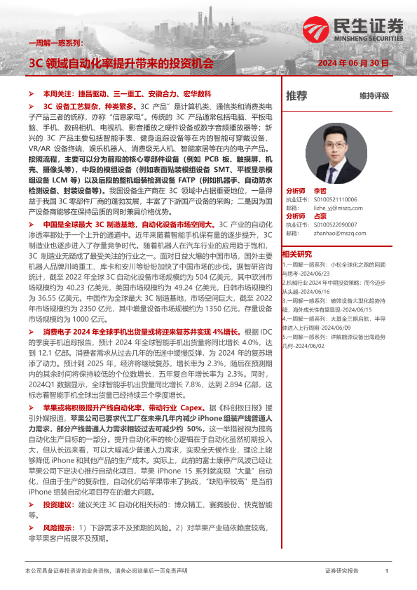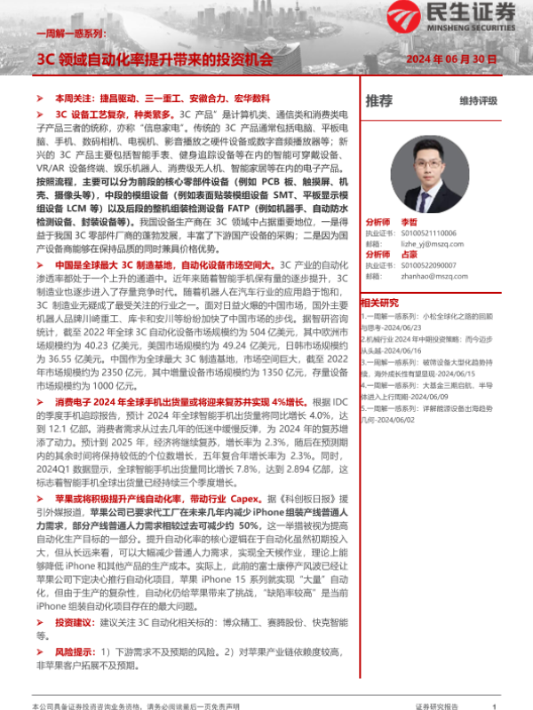【民生证券】【20240630】机械一周解一惑系列:3C领域自动化率提升带来的投资机会-14页