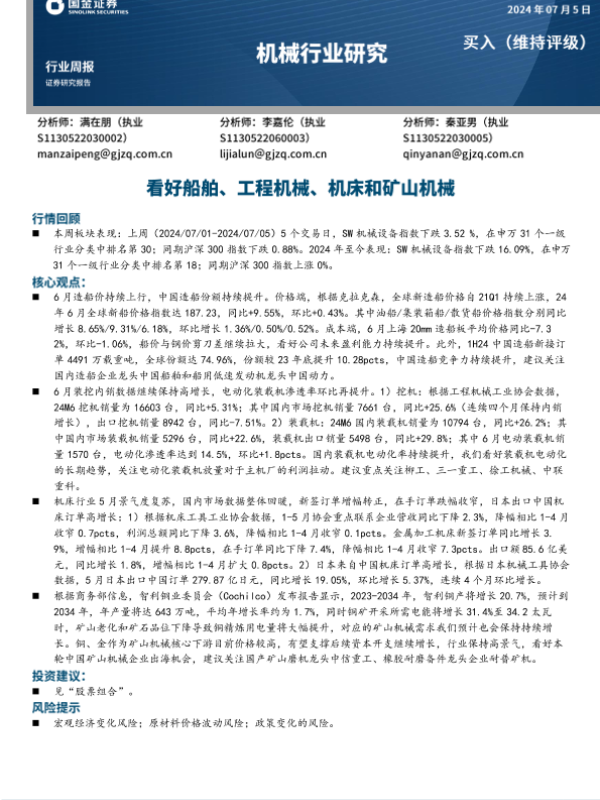 【国金证券】【20240705】20240705-国金证券-机械行业研究:看好船舶、工程机械、机床和矿山机械-20页