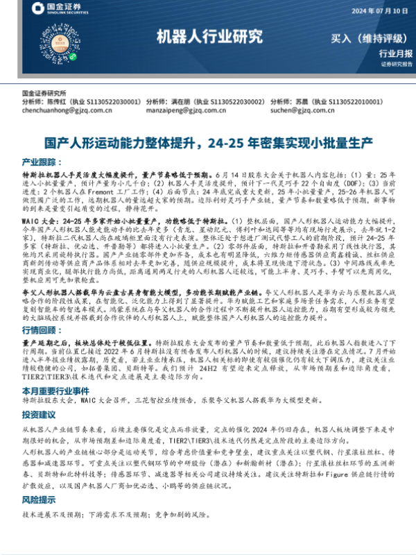 【国金证券】【20240710】国金证券-机器人行业研究:国产人形运动能力整体提升,24-25年密集实现小批量生产-13页