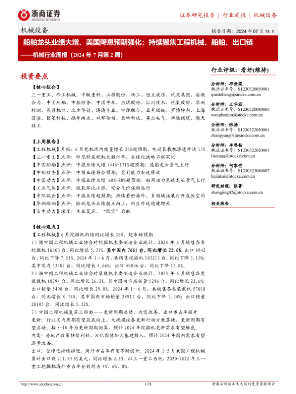 【浙商证券】【20240714】20240714-浙商证券-机械行业周报(2024年7月第2周):船舶龙头业绩大增、美国降息预期强化;持续聚焦工程机械、船舶、出口链-28页